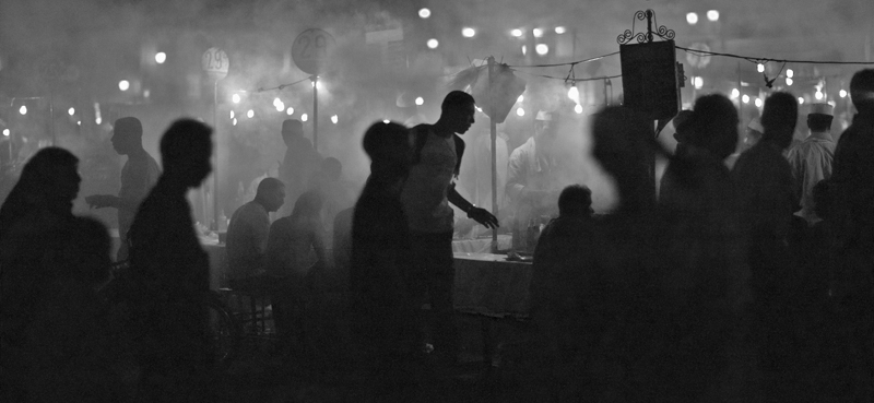 Taken with a Canon 1Ds and 85mm f/1.2, 1/800s @ f1.2, ISO 1250 on the market place in Marrakech at night.