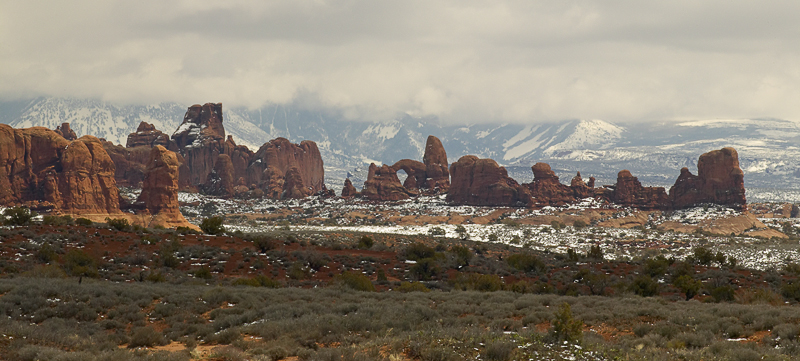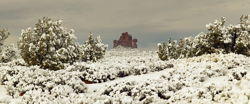 In Arches National park early morning after snowfall. Taken with a Canon 1Ds and 85 mm f/1.2, 1/50s @ f16, ISO 100.