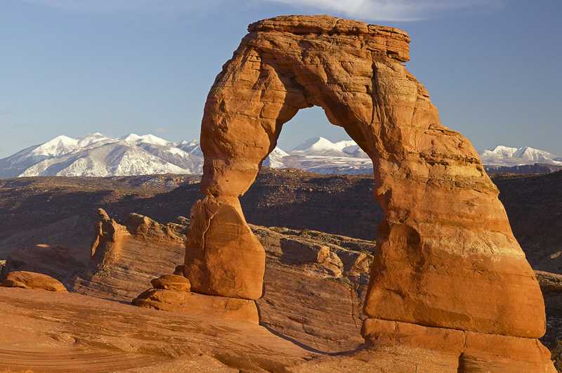 Another classic picture of Delicate Arch late afternoon. In the Background the snow covered La Sal mountain range. Taken with a Canon 1Ds and 85 mm f/1.2, 1/80s @ f11, ISO 100.