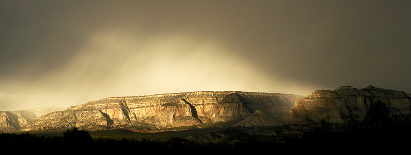 Zion National Park area at sunset during a thunderstorm with a Canon 1Ds and 24-70 mm f/2.8, 1/6s @ f22, ISO 100.